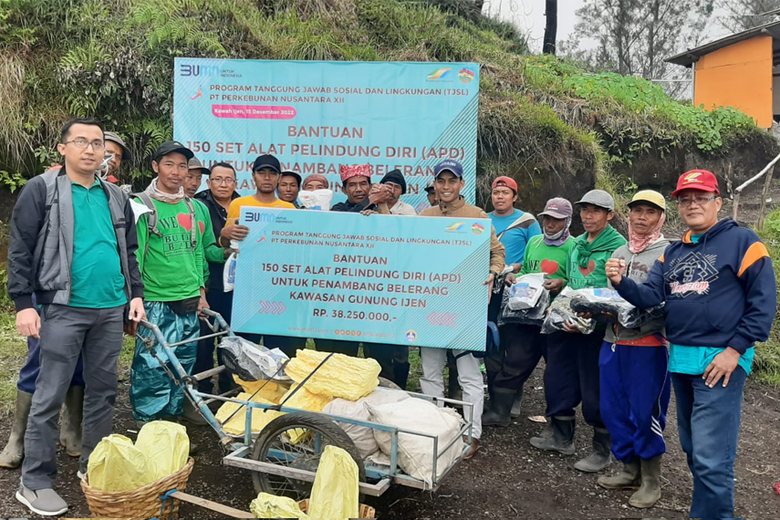 Kamis, 15 Desember 2022 siang, dalam rangka mendukung para penambang belerang di kawasan Ijen agar dapat bekerja dengan aman dan nyaman, PT Perkebunan Nusantara XII memberikan bantuan Alat Pelindung Diri (APD) berupa sepatu bot dan masker gas masing – masing sejumlah 150 buah dengan total nilai sebesar Rp38 juta. Penyaluran bantuan APD untuk para penambang belerang ini dilakukan di puncak gunung Ijen, Bondowoso. Sebanyak 150 orang penambang belerang hadir dalam prosesi penyerahan bantuan APD oleh Manajer PTPN XII Kebun Blawan, Tatang Setiawan, sebagai perwakilan Manajemen PTPN XII tersebut.